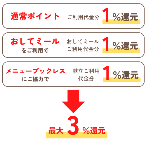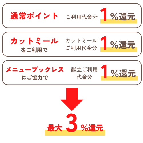 3,000ポイント以上貯まるとヨシケイクーポンをはじめ、商品券や、グルメギフトと交換することができます。商品は、3つのコースの中から選べます。